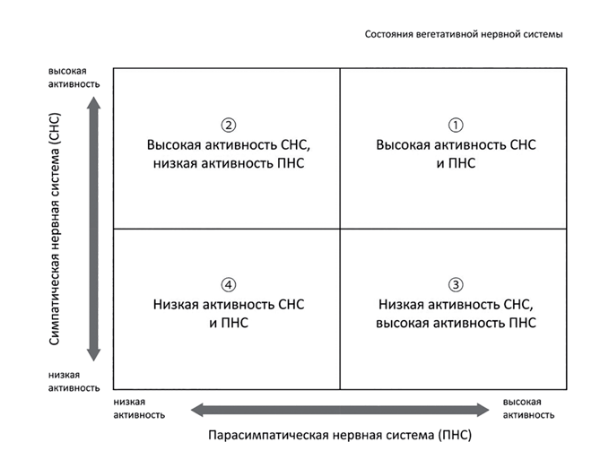 Состояние, при котором обе нервные системы функционируют оптимально, соответствует первому паттерну (1. Обе нервные системы активны). На общее состояние вегетативной нервной системы влияет не только высокий или низкий уровень активности каждой из систем, но и баланс между ними. Высокая активность важна, но состояние, когда одна из систем имеет крайне высокий уровень активности, а другая – крайне низкий, может быть опасным для здоровья. Хороший баланс важен не только для работы вегетативной нервной системы, но и для общего психоэмоционального и физического благополучия человека.