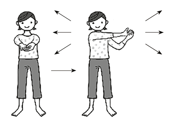 • Вытяните обе руки вперед, левой рукой ухватите кончики пальцев правой руки.