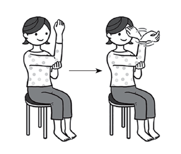 • Это упражнение можно выполнять как стоя, так и сидя. Выпрямите спину, вытяните правую руку вперед и согните локоть под прямым углом так, чтобы запястье было повернуто вверх. Ухватите правый локоть левой рукой и удерживайте его в этом положении. В этом же положение вращайте правым запястьем. Поменяйте руки и повторите упражнение на левую сторону.