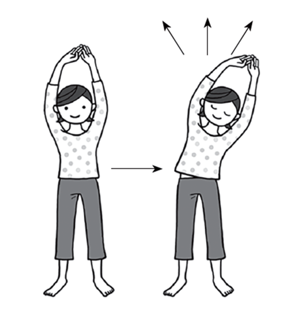 • Поднимите обе руки вверх, затем левой рукой захватите как можно дальше пальцы правой руки.