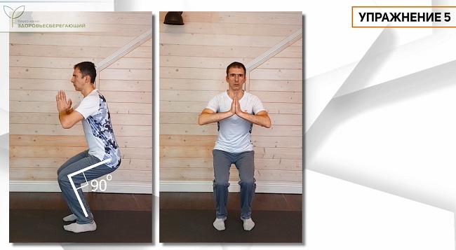 1. Согните ноги в коленях под углом 90°, и сядьте на воображаемый стул, наклонив корпус вперёд. Постарайтесь «посидеть» на нём как можно дольше.
