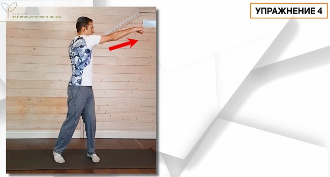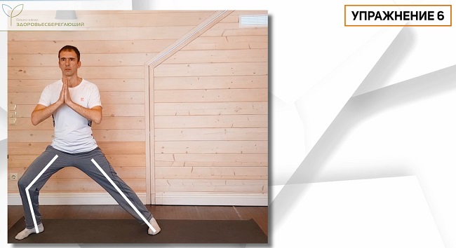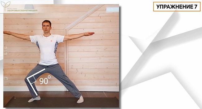 Исходное положение: стоя, ноги широко расставлены, стопы направлены вперёд, прямые руки расставлены в стороны параллельно полу.