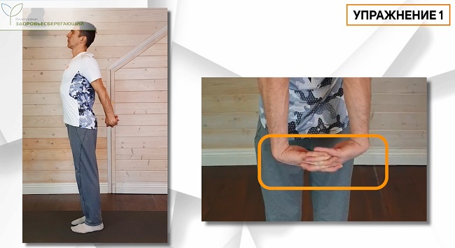 1. Сплетите пальцы рук за спиной ладонями к себе.