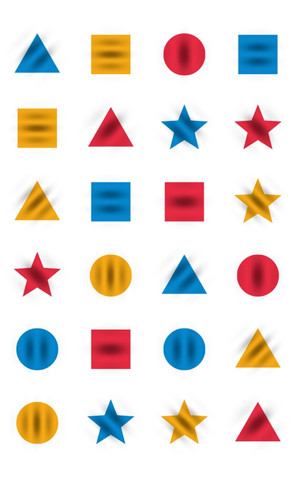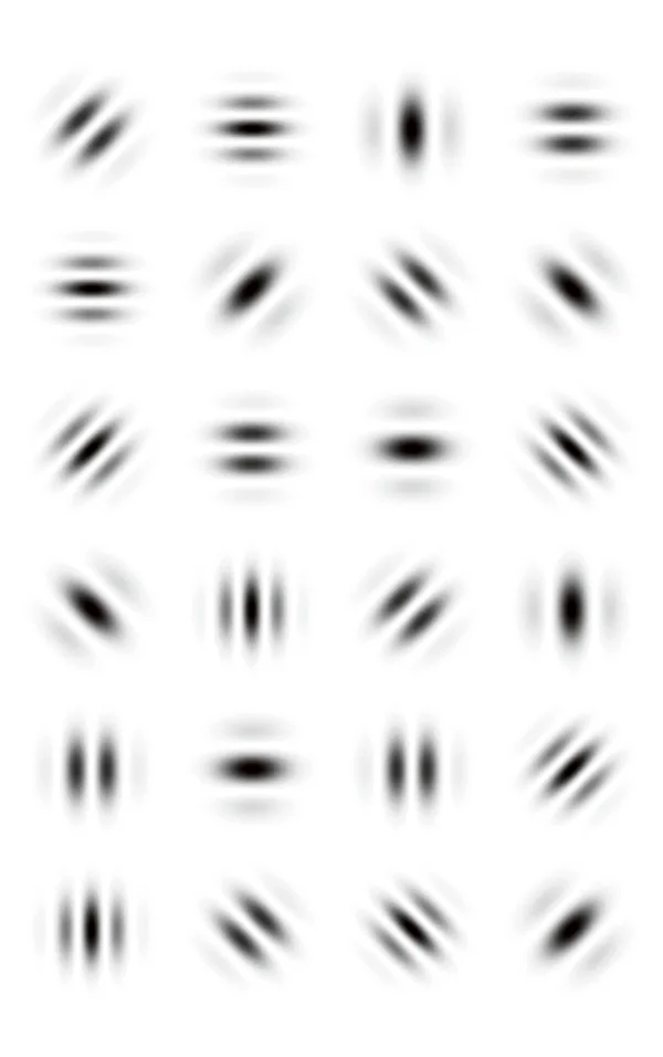Например "двойник" для самого первого в первом ряду пятна Габора - расположен в 4-м ряду. Нашли его? Правильно - третий. А теперь попробуйте найти для остальных пятен пару.