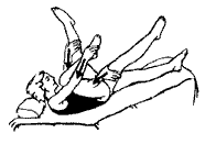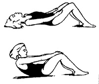 Лежа на спине, согните ноги в коленях, не отрывая стоп от пола. Положите руки на бедра. Медленно вдыхая, приподнимите голову и туловище. Руки при этом скользят к коленям. Медленно выдыхая, вернитесь в исходное положение.