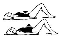 Положение: лежа на спине, руки вдоль туловища, ноги приподняты под углом 15-20 град, между стопами зажата маленькая подушка. Медленно вдыхая, прогнитесь в пояснице, оторвав ягодицы от матраса. Медленно выдыхая, вернитесь в исходное положение.