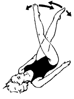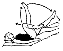 Лежа на спине, расположив руки вдоль туловища, поднимите ноги вертикально вверх. Покрутите одновременно обеими стопами внутрь, затем наружу.