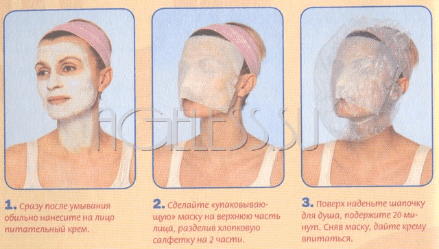 Вечером после умывания нанесите на лицо питательный крем толстым слоем, сверху наложите «упаковывающую» маску, пропитанную водой. Поверх всего наденьте шапочку для душа. Благодаря термоэффекту, создаваемому шапочкой для душа, поры открываются и увлажняющие частицы крема проникают непосредственно внутрь кожи. Ее состояние постепенно улучшается, она становится здоровой, гладкой и шелковистой.