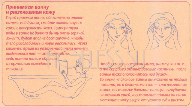 Особенно хороша «поясная» ванна. Так как горячая вода закрывает ваше тело только по пояс, вы с наименьшим риском для сердца можете принимать такую ванну длительное время. В этом ее преимущество. Пока вы лежите в ванной и наслаждаетесь чтением интересной книжки, ваши поры открываются, кожа дышит, избавляясь от вредных токсинов.