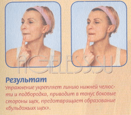 Это упражнение лучше всего выполнять в положении сидя. Втяните нижнюю губу внутрь, «обнимите» ею нижние зубы, оттягивая и прижимая при этом уголки губ к задним зубам Верхнюю губу держите плотно прижатой к верхним зубам. Поставьте указательный палец на подбородок и надавите на него, чтобы создать легкое сопротивление. В таком положении открывайте и закрывайте рот медленными черпающими движениями, помогая себе при этом только уголками губ. Каждый раз вытягивайте подбородок вперед примерно на 1 сантиметр. Повторяйте движение, пока не почувствуете характерное жжение вдоль линии подбородка. Выполняйте упражнение 2 раза вдень.