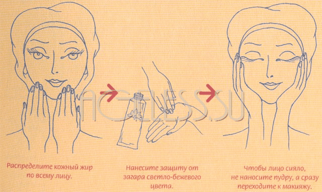 Надавите чистыми руками на лицо, распределите равномерно кожный жир. Дайте лицу 2-3 минуты привыкнуть. Далее поверх натурального крема нанесите основу, защищающую от загара. Тип латекса, похожий на крем, бледно-бежевого цвета, в этом случае очень прост в применении. Однако не переусердствуйте: лучше меньше, чем больше. Благодаря смешиванию изначально бледной основы и кожного жира создается эффект здоровой белизны и достаточной увлажненности. А также благодаря рассеивающим веществам, содержащимся в косметике от загара, под освещением ваша кожа будет выглядеть сияющей. Но самое главное — «хитрая уловка » скроет от посторонних глаз прыщи и расширенные поры и ваше лицо будет выглядеть великолепно.