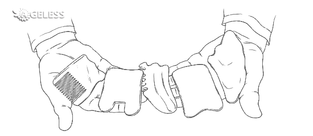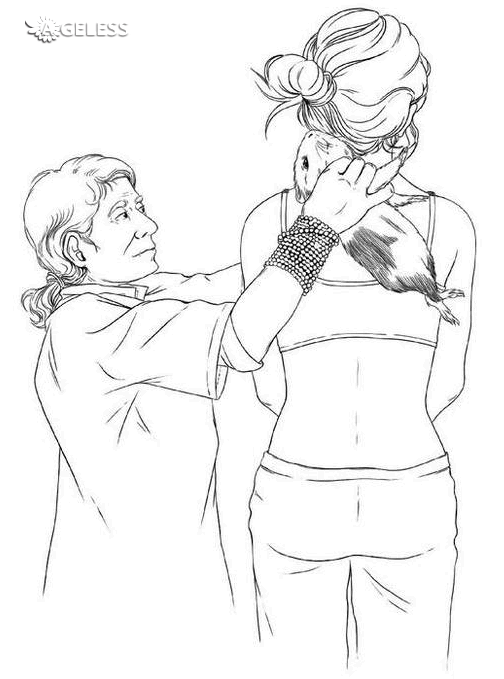 Две нагретые ложки помещают под подбородком. Их опускают медленно вниз по гортани до впадины. Ложками разглаживается кожа от центра в стороны, как можно дальше за шею, почти замыкая круг. Не следует сильно надавливать и натягивать кожу. Необходимо 12 подходов.