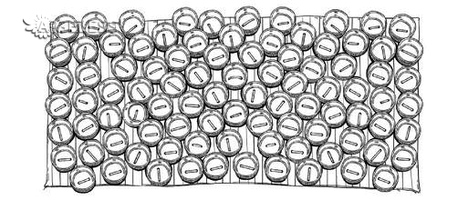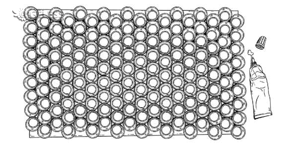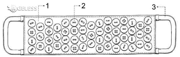 Если у вас найдется коллекция пуговиц различного размера, цвета и материала (из пластмассы или дерева) и кусок ткани, то можно изготовить массажер полотенце, которым выполняется более интенсивный массаж на спине, бедрах, руках. Он представляет собой полоску прочной ткани (1), на которую нашито множество больших пуговиц (2). К торцам полосы пришиты прочные ручки (3), например от отслуживших синтетических сумок. Для большей подвижности пуговиц их нашивают вертикальными рядами вогнутой стороной к ткани. Пуговицы должны быть пластмассовыми (не металлическими!), достаточно крупными, толстыми и гладкими, без зазубрин и рисунка.